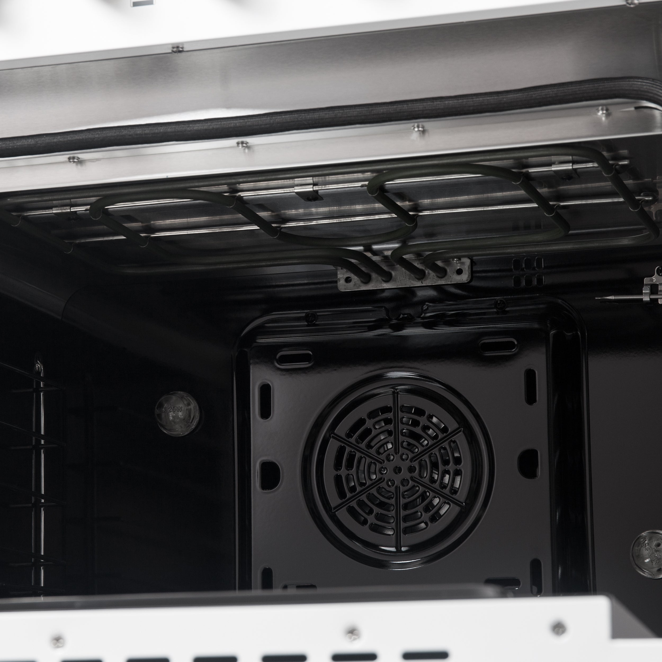 The Galiano 48" Dual Fuel Range blends professional style and performance in elegant white with antique brass accessories. Featuring eight sealed burners with a total output of 107,000 BTU, including a powerful 20,000 BTU dual-ring burner for boiling or searing, it gently simmers delicate foods, such as chocolate and sauces. The cast iron grates provide stability and smooth pan sliding, while the 6.58 cu. ft. electric oven delivers 9,700 watts of power, making it perfect for baking, roasting, and broiling with true convection options. Included are four oven racks, an LP conversion kit, and elegant zinc-coated metal knobs with bezel rings that retain their beauty.